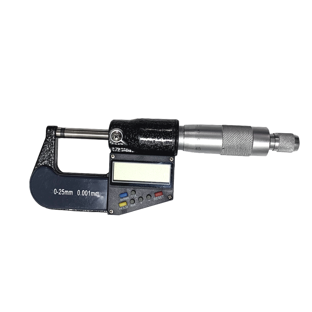 Micrômetro digital para medições precisas de 0 a 25 mm, com resolução de 0,001 mm.