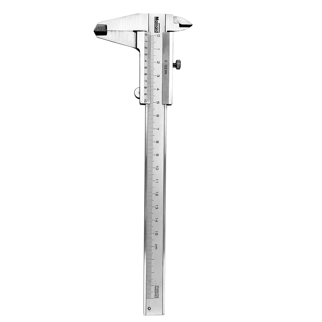 Paquímetro com capacidade de 150 mm, leitura de 0,01 mm e resolução de 0,02 mm.